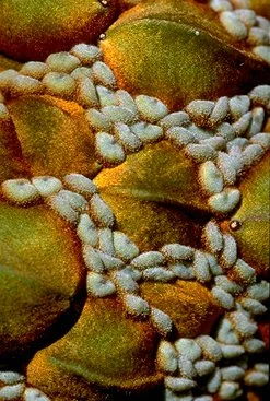 When Australia and Antarctica separated 50 million years ago, rain forests covered the land. As Australia drifted north and the climate grew more arid, leaching and erosion left patchy soils. Isolation and adaptation to new conditions produced new varieties of plants, such as the more than 95 species of Dryandra (3). To lure pollinators, grass trees send flower spikes skyward (4). For green algae (5, under a non-native grass) adaptation means going dormant until rains revive them.